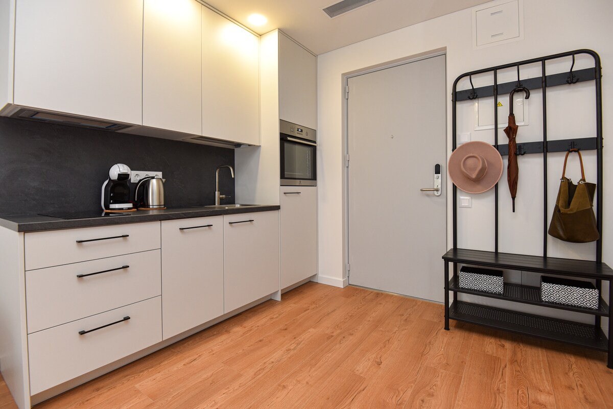 Apartamentai Akvilė: apartamento moderno, acogedor y espacioso en el centro de Šilutė. Cuenta con una cama tamaño king, sofá cama, TV de pantalla plana y una cocina totalmente equipada con lavavajillas. El baño incluye bañera, lavadora, secadora, secador de pelo y calentador de toallas. Incluye calefacción regulable, aire acondicionado, wifi, un amplio balcón y aparcamiento público gratuito cerca.