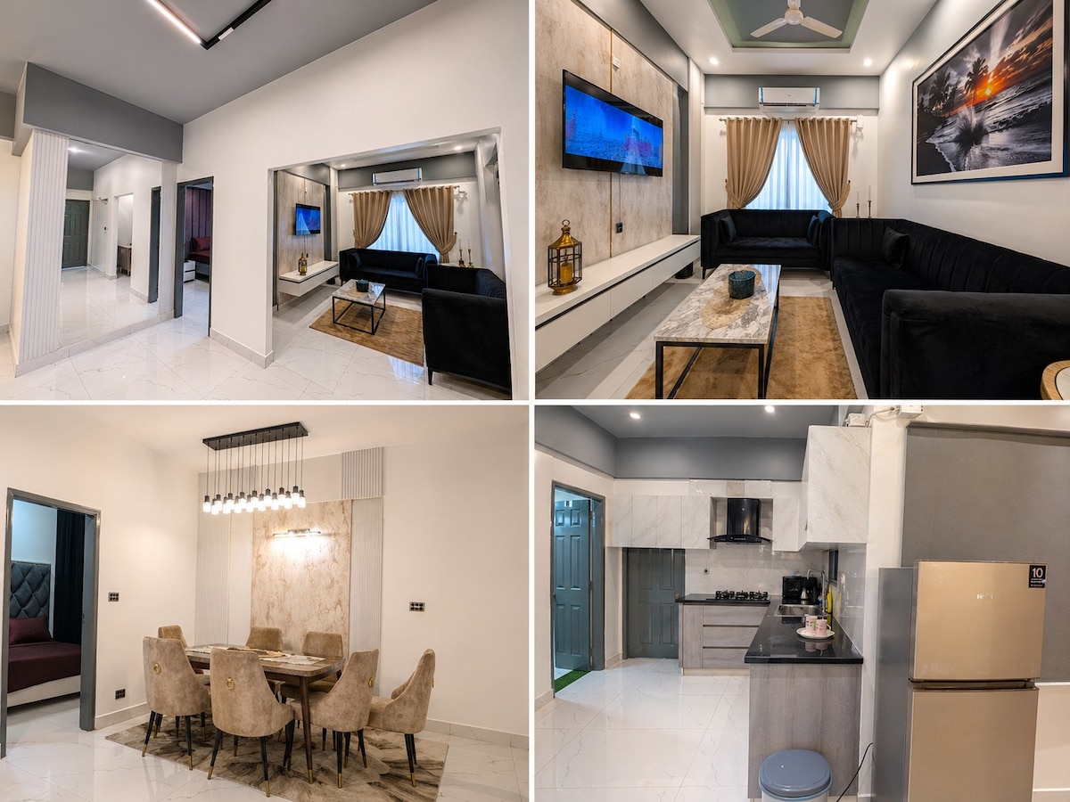 Bienvenido a nuestro apartamento bien amueblado de 3 dormitorios, cada uno con baño adjunto y aire acondicionado. El apartamento también cuenta con una acogedora sala de estar, salón y cocina totalmente equipada, por lo que es perfecta para familias o grupos. Con un amplio espacio, puede alojar cómodamente hasta 5 personas. Situado en el corazón de la fase 6 de DHA, Nishat Commercial, el apartamento está a solo 1,5 a 2 kilómetros de Sea View, lo que proporciona un fácil acceso a la playa. Nos enorgullece ofrecer la mejor hospitalidad a nuestros huéspedes