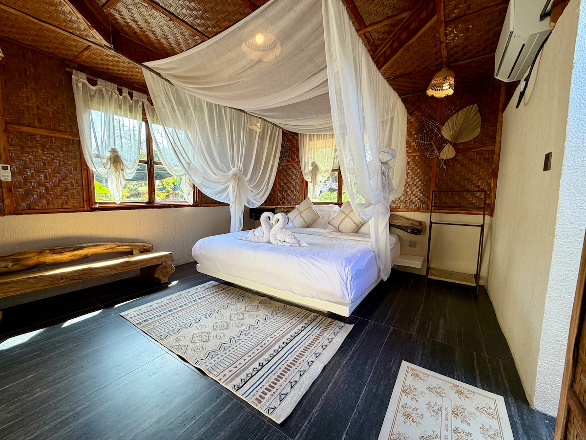 An independent garden cabin beside the pool offering extra privacy and a relaxed tropical atmosphere. Built with traditional local comba, the space stays naturally airy and comfortable. The semi-open kitchen and tropical open-air bathroom create a unique island living experience. Enjoy fast Starlink Wi-Fi, stable electricity ⚡ supported by our hybrid solar, battery, and generator system, excellent water pressure 🚿, and our naturally filtered 90 m² swimming pool just outside your door.