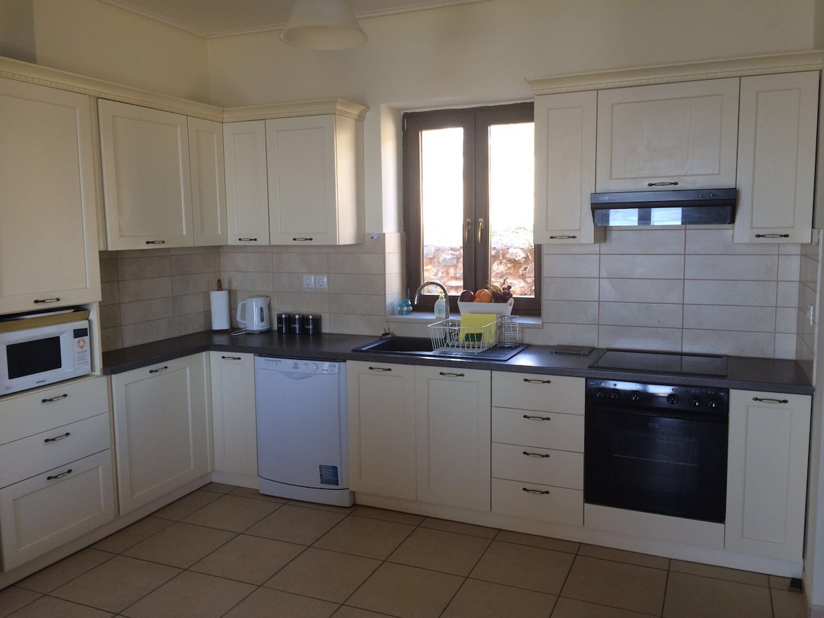 La casa es de 135 metros cuadrados y consta de: 4 dormitorios, salón, cocina, espacio abierto con chimenea, 2 baños y 2 balcones. Está equipada con todos los utensilios necesarios para preparar una comida completa (cocina, nevera, hervidor, tostadora). Tiene capacidad para 8 personas. En una habitación doble con baño y nevera existe la posibilidad de autonomía del resto de la casa. En la planta baja se encuentra nuestra taberna tradicional "Paralia" y le espera para que pruebe los platos tradicionales de la tierra de Laconia.