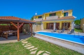 La casa de vacaciones de un dormitorio (casa adosada) tiene capacidad para 4 personas (2+2). Se encuentra en un típico pueblo de Istria con impresionantes vistas a Motovun y al oasis verde de Istria Central. La casa cuenta con piscina privada climatizada, aire acondicionado (refrigeración y calefacción), wifi gratuito, TV por cable inteligente, aparcamiento privado y se encuentra a poca distancia en coche de las principales atracciones turísticas e históricas de Istria. Desde 2024, la casa cuenta con su propia central eléctrica, por lo que es autosuficiente en energía.
