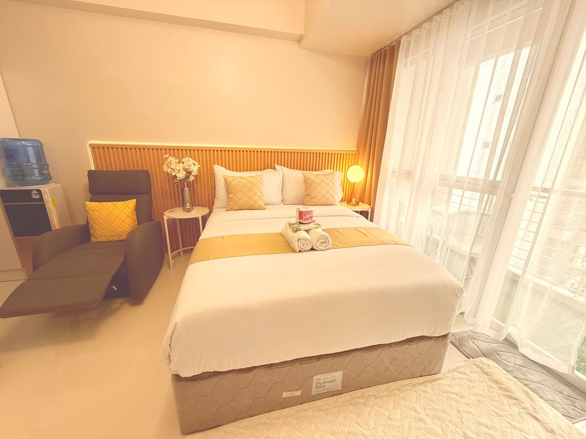 Hotel-Inspired Studio Unit with balcony facing pool & kids playground. Behind SM Lanang/SMX Convention Center, Beside Iqor Building and Whisky Park (Asia biggest liquor park), Acacia Hotel, Grand Regal, Azuela Cove, Dusit Thani, Waterfront Insular, Davao Airport, Abreeza Mall, SPMC . Enjoy fast 600 Mbps internet, perfect for remote work or streaming. Perfect for business trips, medical stays, couples, families, and staycations — comfort, style, and convenience all in one top-tier location.