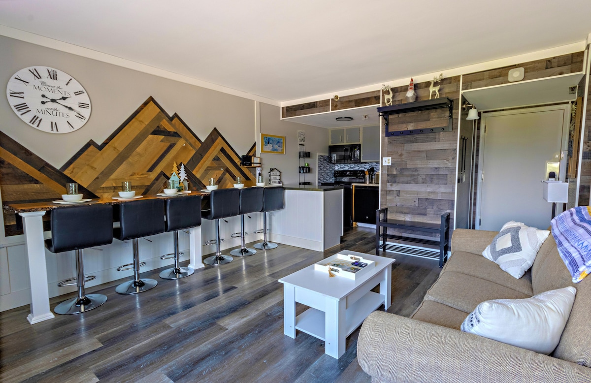 Alójate en el pueblo y entra/sale en bicicleta desde el patio. No busques más, solo hay 2 unidades en el pueblo que ofrecen esta ventaja. El nuestro es uno de los dos. Apartamento en el primer piso totalmente actualizado con un dormitorio privado. Ponte en contacto con menos el check-in, evita las líneas de llegada y ve directamente al alojamiento. Novedades para la temporada de invierno 2025-2026: ¡hemos mejorado nuestros suelos y muebles de salón! ¡Nuevo sofá cama y silla relajante, suelo de madera más brillante! *Algunas imágenes pueden reflejar suelos y muebles más antiguos