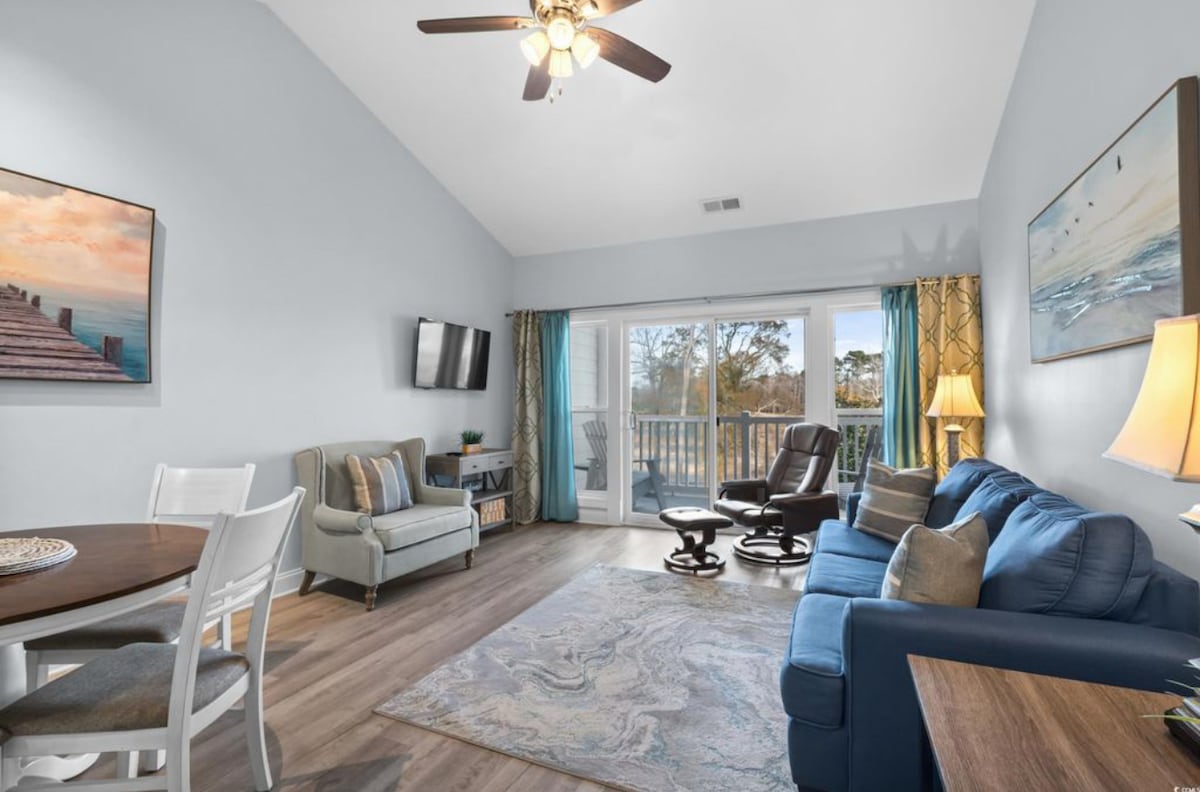 Relájate y desconecta en este alojamiento renovado, tranquilo y elegante. Convenientemente ubicado cerca de todas las atracciones de Myrtle Beach. ¡Fantástica escapada para un viaje en familia o unas vacaciones en la playa! Disfruta de nuestros servicios de café Keurig de cortesía. ¡Consigue el sueño que realmente mereces en nuestras camas tamaño king de primera calidad en ambos dormitorios! El sofá cama extraíble tiene capacidad para dos personas más en un colchón de espuma viscoelástica de alta calidad. Disfruta de tu café en las tumbonas del patio, respaldadas por el bosque. Piscina y jacuzzi en el sitio de abril a octubre.