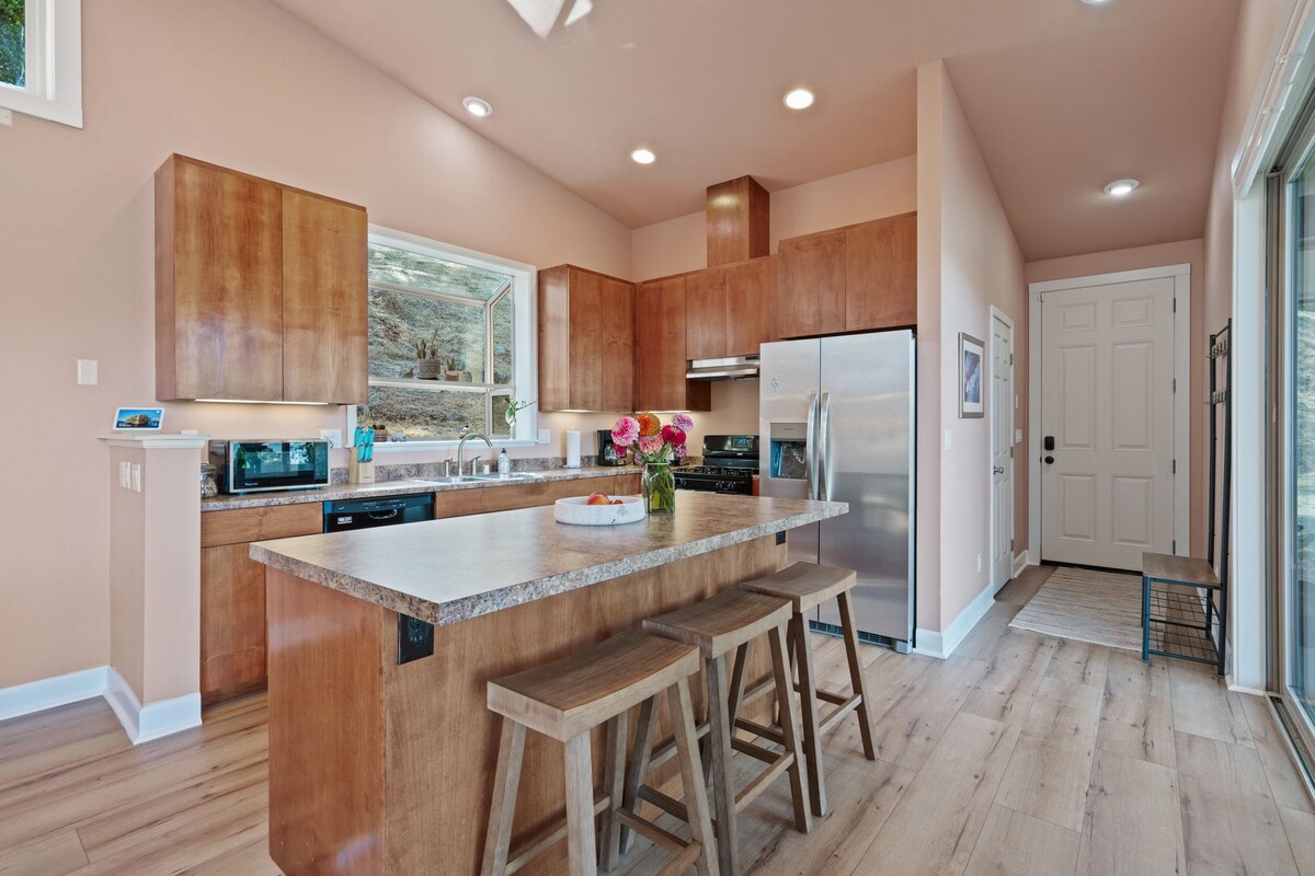 Bienvenido a nuestra moderna cabaña de granja recientemente renovada, ubicada en un acre privado rodeado de majestuosos abetos de Douglas de 200 pies. Disfruta del arroyo estacional que adorna el patio trasero durante la temporada de lluvias, proporcionando un refugio tranquilo. Perfecta para una escapada tranquila o un trabajo remoto productivo, nuestra cabaña cuenta con internet de alta velocidad y comodidades modernas. Explora las aventuras de senderismo, ciclismo y natación de Cobb Mountain, todo a poca distancia.