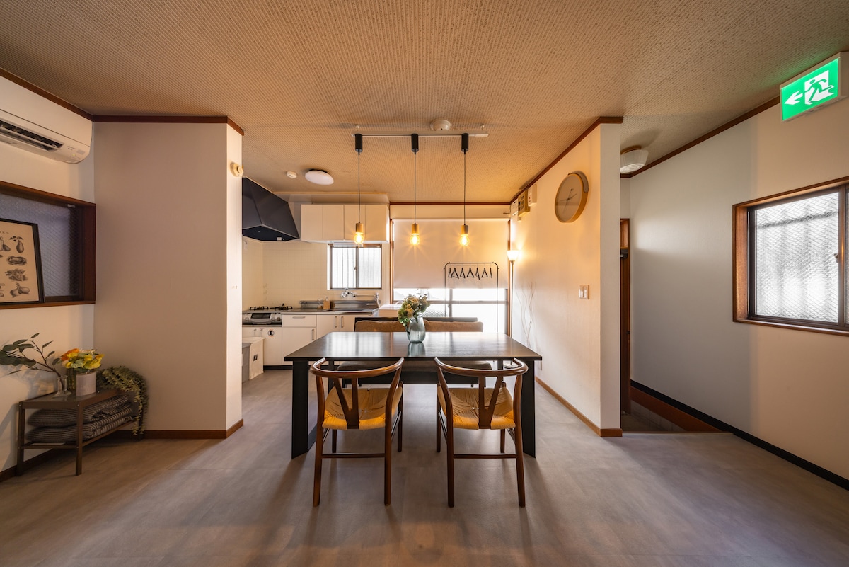 Habitación en el segundo piso de un edificio de dos pisos. En la primera planta hay una entrada y un cuarto de baño, y la entrada principal y el restaurante están separados. Además de ser un alojamiento en un destino turístico, hemos cuidado el diseño de los muebles y el espacio para que pueda disfrutar de las instalaciones con tranquilidad. En el comedor con cocina americana, podrá disfrutar de la música grata compañía con nuestros altavoces de alta calidad. Disfrute del aroma y la textura del suelo de pino, que es raro de encontrar hoy en día. En el dormitorio, teniendo en cuenta a los niños pequeños, se proporcionan futones gruesos en lugar de camas. Además, el área de los futones está ligeramente elevada sobre el suelo. Es una de las instalaciones de alojamiento más cercanas a la estación de Uno, con excelente acceso a islas remotas como Naoshima. Cerca de tiendas de conveniencia y restaurantes populares. Se habla inglés.