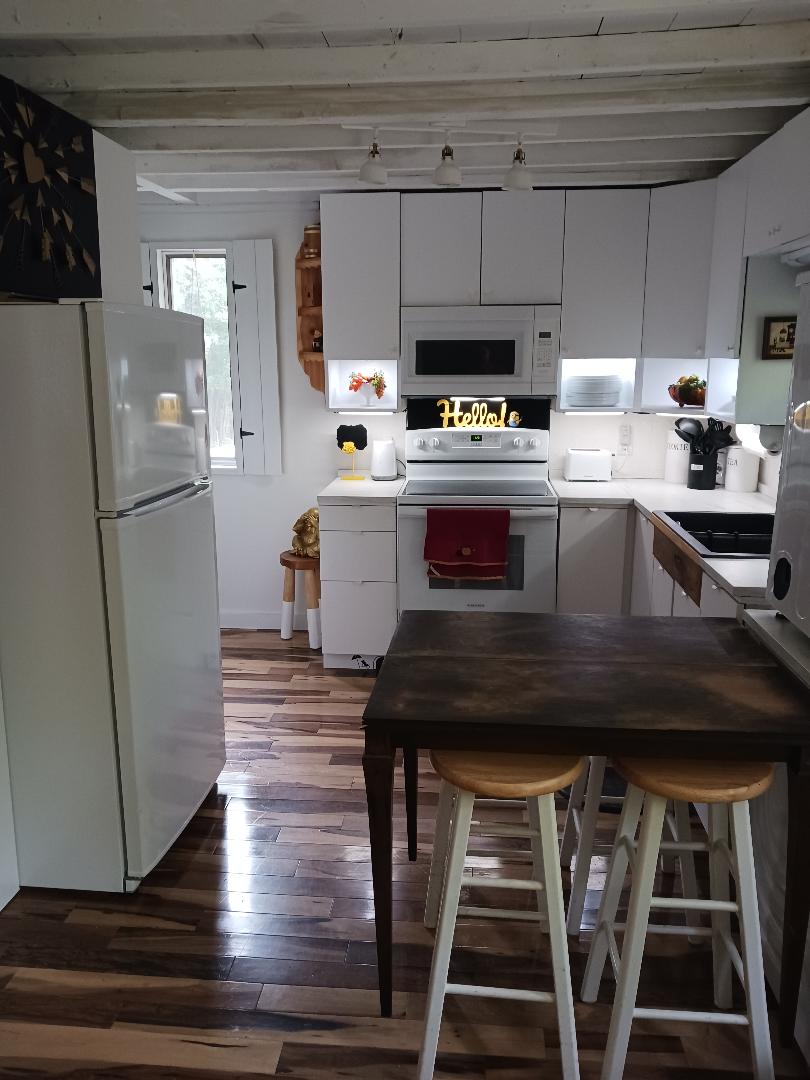 Deer Haven es una casa pequeña (192 pies cuadrados) ubicada en mi patio trasero, con vistas a acres de bosque. El espacio es pequeño y sencillo. Llega a la cama tamaño queen en el loft para dormir subiendo la escalera. El baño tiene un inodoro y una ducha de tanque de almacenamiento. La cocina cuenta con servicios básicos: nevera, microondas, placa eléctrica, plancha, platos, etc. El mejor lugar de la casa es el sofá, donde se puede ver la chimenea y los preciosos bosques por la puerta del patio.