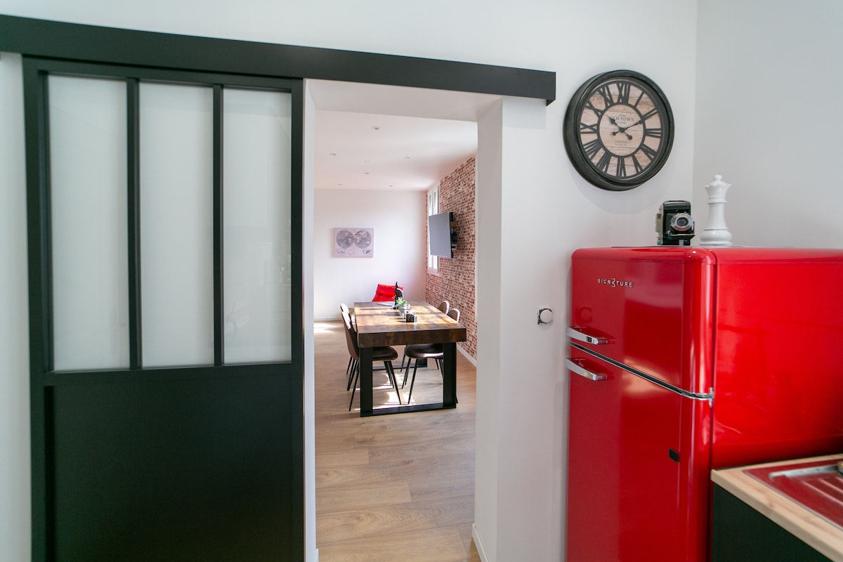 Bienvenue dans notre superbe appartement de 2 chambres, idéalement situé en plein cœur de Nemours. Conçu dans un style loft industriel de photographe, cet espace unique combine charme et modernité pour vous offrir un séjour inoubliable. /!\ FÊTES INTERDITES /!\ Balnéo - 2 chambres spacieuses et confortables, la deuxième est situé à l'étage, accès par escalier, chacune équipée d'un lit double, peut accueillir jusqu'à 4 personnes. Locations Pour tournages / Shooting photos avec supplément
