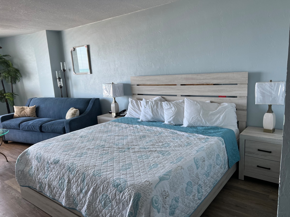 ¡Lo encontraste! 🎆 El condominio 🌅estudio perfecto frente a la playa para ver 😎 escuchar la dulce calma de las olas🌊. Disfruta de la playa🏖️, piscina exterior extra grande🏊♀️, piscina 🔥 CUBIERTA CLIMATIZADA, BAR//COMIDA ubicada en la terraza de la piscina. Maravillosa ubicación con 🛒restaurantes de tiendas de comestibles 🍔🌭🥗🍕🍟🥞🍦🍭 y tiendas de regalos fácilmente a pocos pasos. A unas 3 km del paseo marítimo de Daytona Beach & Bandshell (conciertos de música gratuitos los 🎶viernes y sábados por la noche (La unidad puede alojar de 1 a 4 personas) Los propietarios son locales y nos vemos pronto. 🤗