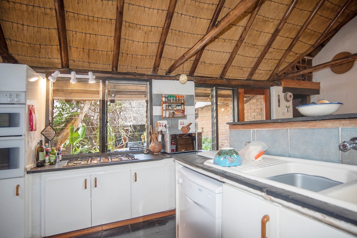 Dos habitaciones dobles con baño privado en una casa bellamente fresca con techo de paja. Tercera habitación individual con baño separado. Acceso directo desde los dormitorios dobles a la piscina de agua salada en un gran jardín a la sombra. Ubicación tranquila y segura en una calle cerrada a pocos pasos de las tiendas y cerca del aeropuerto y del centro de la ciudad. Estacionamiento seguro. Uso de toda la casa y todos los servicios, incluido el wifi.