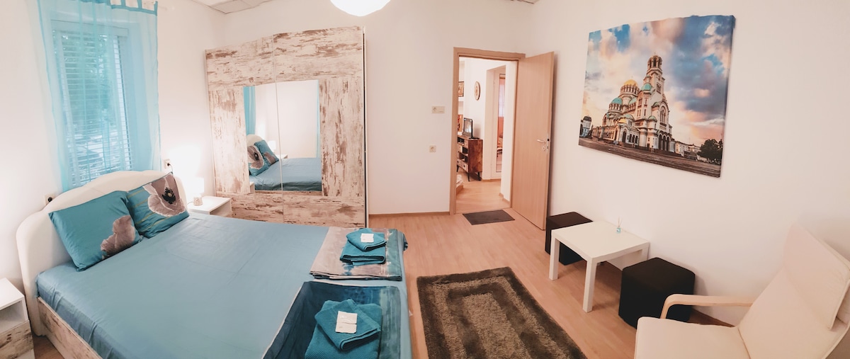 Amplio apartamento con cocina abierta, comedor y sala de estar; un dormitorio con cama tamaño king y escritorio de oficina; dos inodoros y una ducha. El sofá en la sala de estar es plegable y puede alojar hasta 2 personas. El apartamento está muy cerca de uno de los parques más bonitos de Sofía. Tiene fácil conexión con el centro de la ciudad. Hay un gran supermercado al otro lado de la calle.
