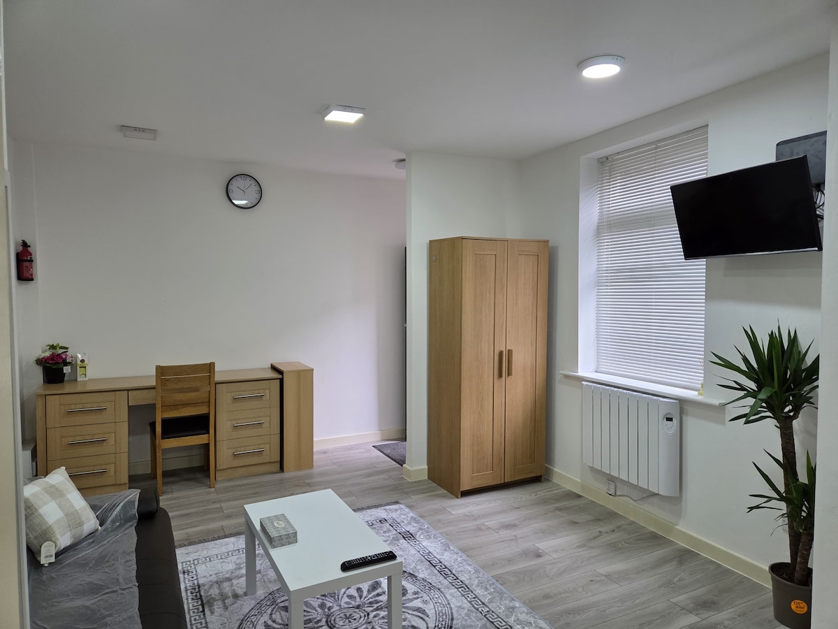 Our new stunning studio apartment in Preston City centre has a king size bed . A comfortable seating area with a large screen smart TV. The kitchen has a fridge, oven, hob,kettle,toaster and microwave. We provide complementary tea,coffee sugar cereal and fresh milk on arrival. A smart shower room with toilet and wash basin and illuminated mirror. Just 20 yards from the new ANIMATE entertainment complex.Reserved parking next to the apartment is included
