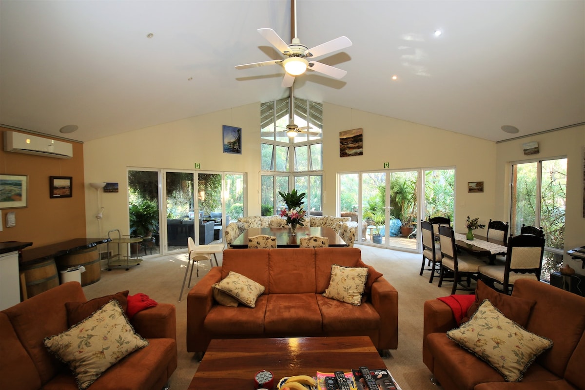 Cada una de nuestras 4 lujosas suites de 4,5 estrellas con cama tamaño king tiene su propio baño con bañera de hidromasaje doble, ducha grande, inodoro separado y está escondida en un hermoso bosque nativo. Wifi gratuito, TV por streaming y desayuno continental gourmet incluido. Las grandes ventanas y la puerta corrediza de vidrio conducen a un patio con vistas a un hermoso jardín y un bosque prístino. Amplia sala de estar común, chimenea y TV de pantalla grande + zona al aire libre con vistas al bosque. Escápate, relájate, disfruta, revive y rejuvenece en un lujo moderno :)