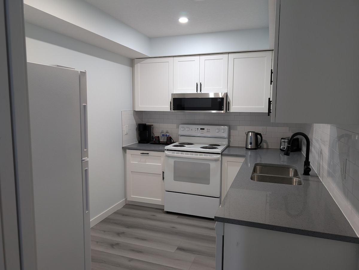 HERMOSO, acogedor y espacioso 1 dormitorio con baño completo, cocina americana/barra de bar y algunos utensilios de cocina con aire acondicionado, ¡pero sin fogones! Cerca del centro de la ciudad y de fácil acceso a las montañas (Banff). La suite no tiene una puerta que separe la casa principal de arriba del sótano, pero tiene una entrada privada a través de una puerta trasera que da a tu sótano. Está en un barrio seguro con muchos senderos para caminar y cuenta con vistas panorámicas de Aspen Woods con espacios verdes detrás de nosotros. ¡Perfecto para RELAJARSE!