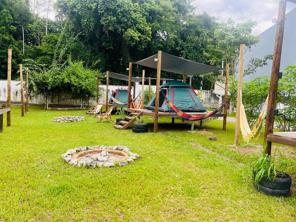 Glamping dos Sonhos é uma experiência campista perfeita para casais ou solo. OFERECEMOS 1 BARRACA GRANDE E COLCHÃO DE CASAL COMO NAS FOTOS que se pode andar em pé dentro, em um visual vislumbrante. E você não precisa montar nada! A ideia é acampar com conforto, tranquilidade e privacidade em um local seguro e em total contato com a natureza . Oferecemos chuveiro quente, mesa de pic-nic, área para fogueira e a vista privilegiada de nosso mirante panorâmico de frente para o mar.