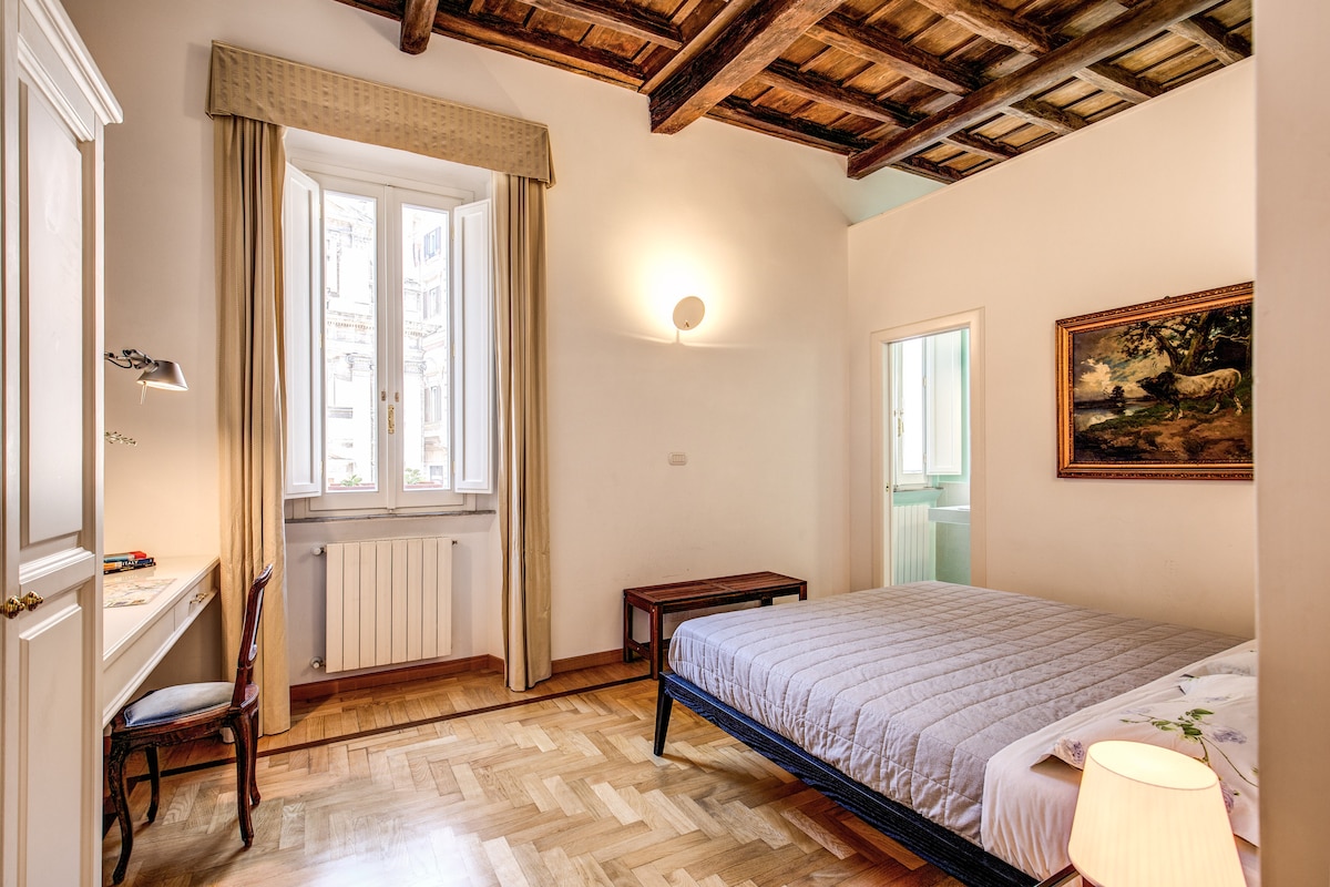 El apartamento está en el segundo piso de un edificio antiguo y restaurado del siglo XVIII (con ascensor) en el corazón de Roma, a pocos pasos de la Plaza de España. Cuenta con una cocina totalmente equipada (horno, microondas, lavavajillas y lavadora), 3 dormitorios (1 con 2 camas, 1 con cama de matrimonio y 1 con cama individual), 3 baños (cada uno con ducha) y una cómoda y espaciosa sala de estar con antiguas vigas de madera en el techo. Cuenta con aire acondicionado, TV italiana y conexión wifi.