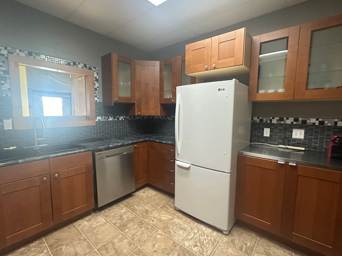 ¡Relájate y recarga energías en esta espaciosa y céntrica suite de 3 dormitorios! Camas tamaño queen en cada habitación y totalmente equipadas para una estancia cómoda. Cocina completa con todo lo que necesitas para preparar una comida, una gran sala de estar y comedor, un amplio baño con tocador doble y ducha de pie, además de lavadora y secadora en la suite. Sal a tu oasis privado en el patio trasero con chimenea y asientos en el patio, perfecto para las noches bajo las estrellas. Estacionamiento privado fuera de la calle incluido. ¡Tu hogar ideal lejos de casa!