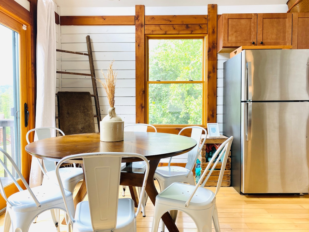 The Porch at Fairystone is your home away from home. This 1 bedroom 1 bathroom vacation home boasts a large open concept with the living area, kitchen and dining area all in one large room. Through a beautiful barn door you’ll find your bedroom and in-unit laundry closet with washer and dryer. Enjoy a beautiful outdoor dining space with chairs for 3 and a grill to cook your favorite meals. Just minutes away from Fairystone State Park, Goose Point, and Philpott Marina, Dam and Lake.