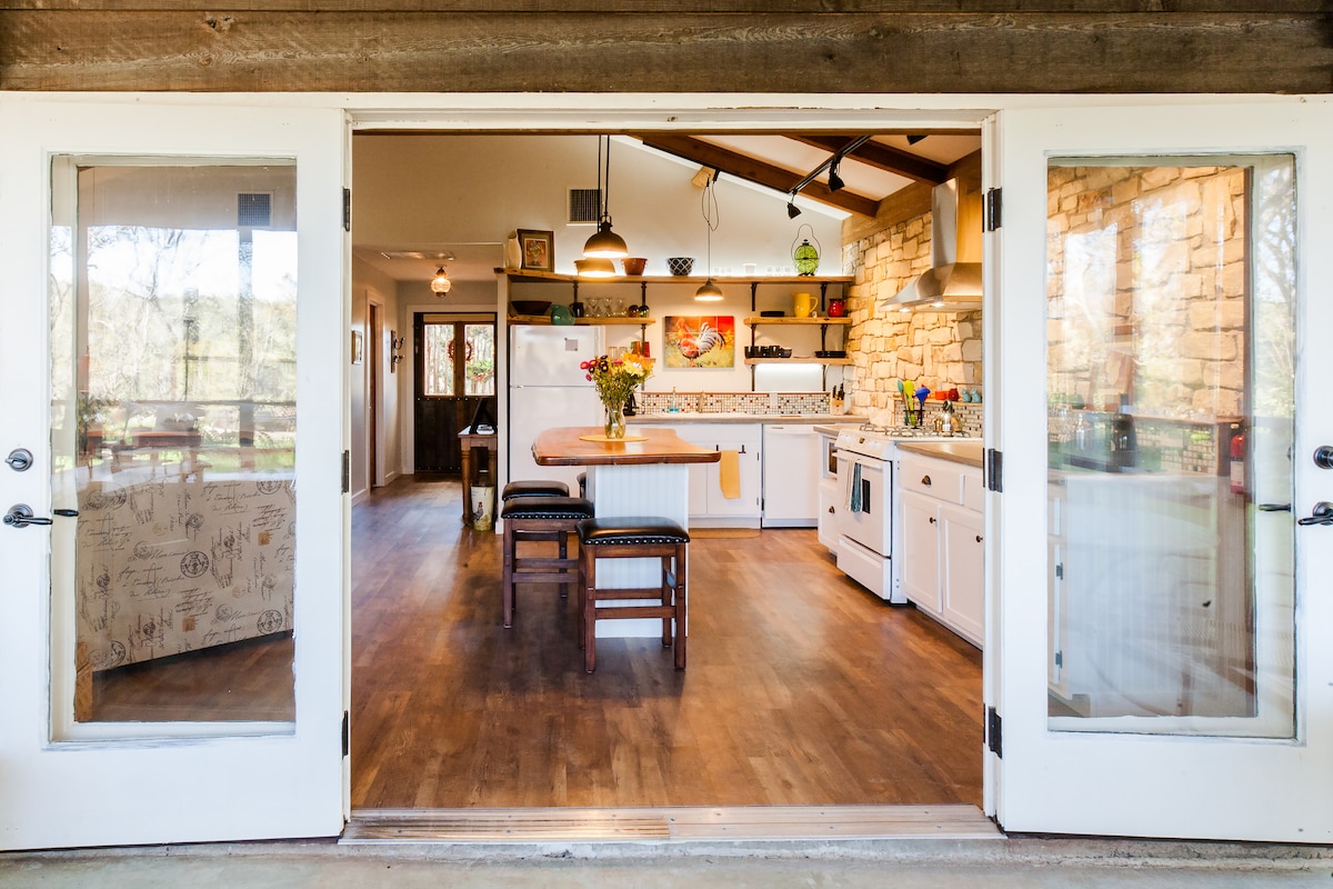 Ubicado a 10 millas al noroeste de Wimberley, TX, en el valle del río Blanco. Robles majestuosos, noches estrelladas y una maravillosa y tranquila casa de piedra tan cómoda que no querrás irte. Solo adultos, debes ser mayor de 21 años para poder reservar. Es posible reservar estancias más largas con precios reducidos, sujeto a las reservas existentes.