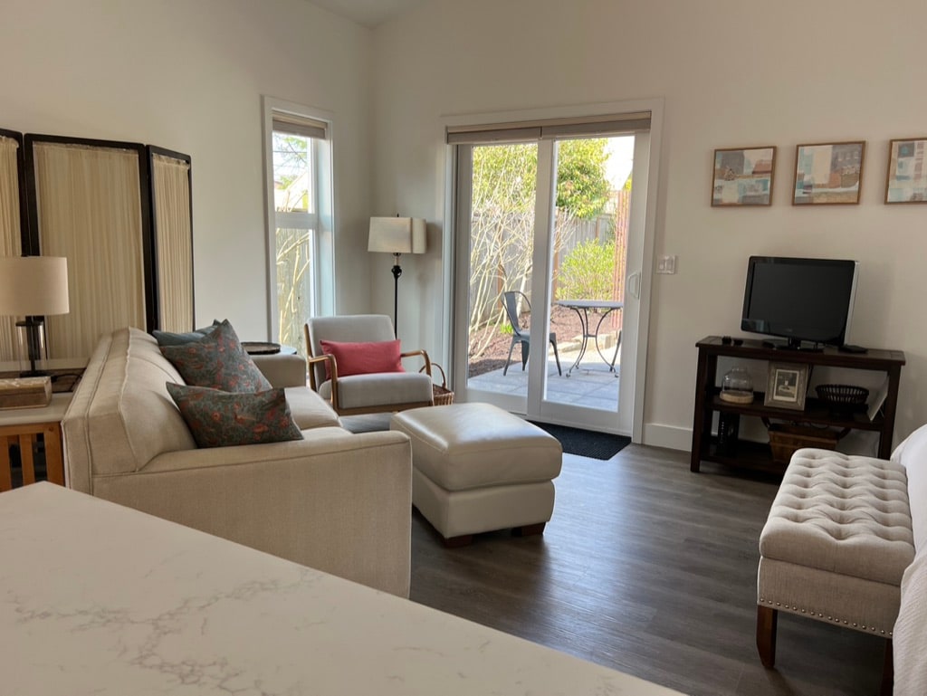 Nuestro 1 dormitorio está completamente surtido con todo lo necesario y algo más ... La casa es la granja original y ha mantenido ese encanto. Tendrás un dormitorio privado con una acogedora cama tamaño king con ropa de cama de lino/algodón orgánico, una cocina totalmente equipada (café, té y crema incluidos), baño completo, con artículos de tocador (la ducha tiene dos asientos y barras de mano, no hay bañera). El área de la sala de estar tiene un sofá cama Joybird Briar, mesa de comedor, chimenea y TV con dispositivo de vapor.