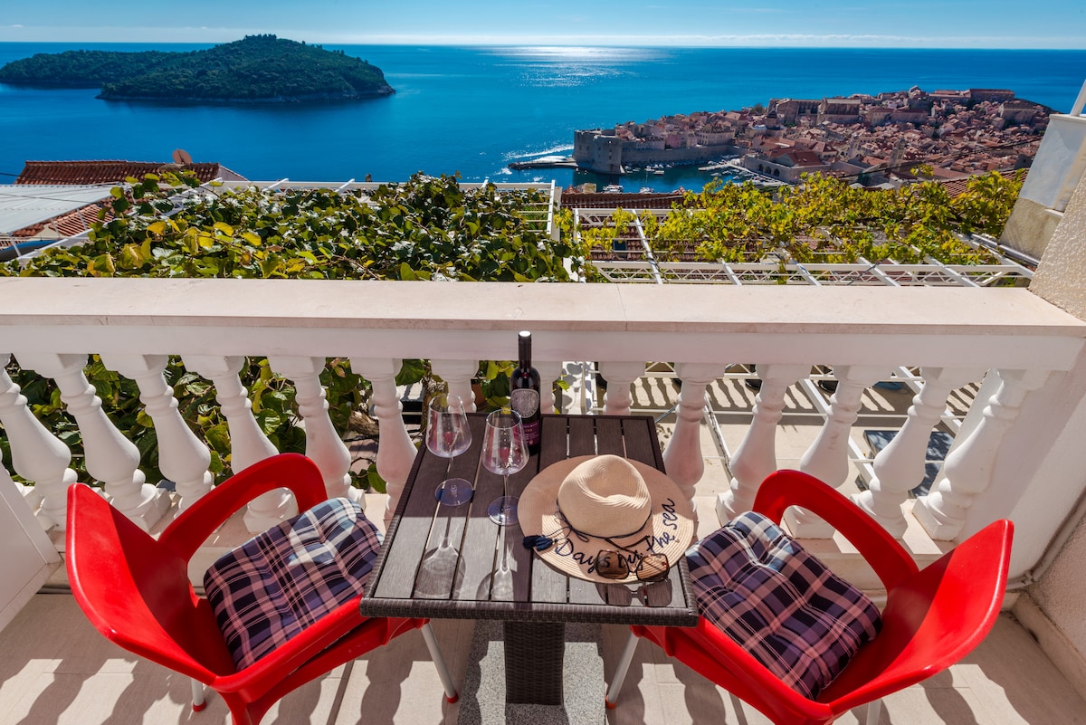Disfruta de unas vistas panorámicas únicas del casco antiguo de Dubrovnik y del Mediterráneo desde tu balcón. Apartamento amueblado con buen gusto, cómodo, espacioso y lleno de luz en un barrio tranquilo y encantador en la ladera de una colina, con abundantes comodidades y estacionamiento reservado enfrente. El apartamento tiene baño y cocina recién reformados, y está equipado con wifi, aire acondicionado y calefacción, TV por cable, altavoz Bluetooth, lavadora y secadora, cómodos colchones y almohadas, ropa de cama de algodón, artículos de aseo de lujo y mucho más.