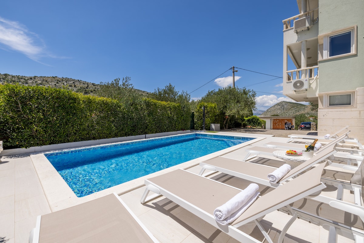 Casa tranquila cerca de Split con piscina climatizada, estacionamiento gratuito y rodeada de olivos, que ofrece paz, privacidad y vistas impresionantes de la Fortaleza de Klis. A solo unos minutos de la ciudad, pero en otro mundo. Disfrute de la comodidad moderna con encanto tradicional: piscina climatizada, cocina al aire libre, olivos centenarios y total privacidad con vistas impresionantes a la famosa fortaleza de Juego de Tronos. 🌿 Su oasis sobre Split: relájese junto a la piscina, cene bajo las estrellas y disfrute de atardeceres inolvidables con total privacidad.