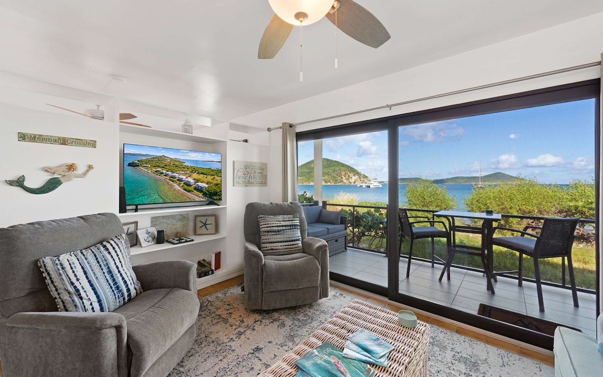 Maridadi Clifftop is perched atop Boatman Point, offering sweeping, south-facing views, and is located just under a 10-minute drive (2 miles) from Cruz Bay. The clifftop boasts a stunning outdoor terrace perched just above the crashing waves, surrounded by lush tropical vegetation. Inside, a modern, air-conditioned unit features a king-size bed, smart TV, ceiling fan, his and hers nightstands, a walk-in closet, a full bathroom, and a living area, creating the perfect romantic Caribbean escape.
