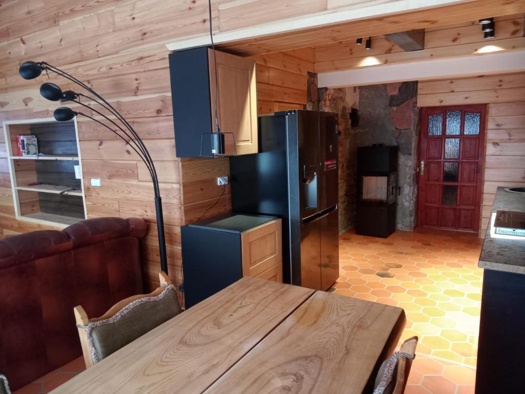 Nueva casa de madera de 75 metros cuadrados donde se encuentra el dormitorio, la sala de estar con cocina, la habitación del wc. Se proporciona una gran terraza con muebles cómodos para los huéspedes, hay una gran parrilla, jacuzzi en la propiedad. La casa puede acomodar hasta 5 personas. La cabaña es perfecta para viajeros extranjeros, justo después de entrar en Lituania desde Polonia. Columpios listos para niños, caja de arena, trampolín, piscina de bolas, karting. Se puede llegar al lago Oria a 7 km con un cómodo acceso para adultos y niños. Llámanos.