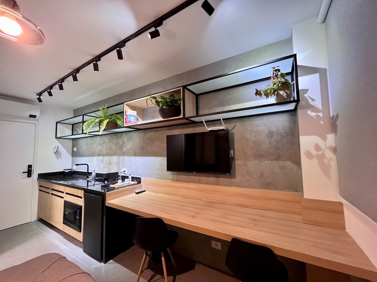 Modern studio condo in Rebouças, 5 min from Mercado Municipal, Shopping Estação, and near cafés and bars. Easy access: 10 min to the bus station, 25 min to the airport. AC + heating; 400 Mb Wi‑Fi + desk; queen bed with hotel‑style linens + blackout shades; equipped kitchen; smart TV streaming; 24 h self check‑in; laundry & gym in the building.