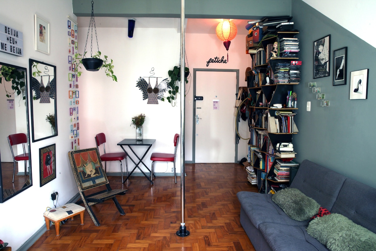 Este lugar tiene su propio estilo. Disfrute de un fin de semana en un apartamento único en Praça da República. Este refugio soleado ofrece una experiencia creativa con pole dance en la sala, una cama colgante en el dormitorio y un baño vintage con bañera. Rodeado de plantas y libros, es un espacio tranquilo e inspirador, cerca de Largo do Arouche. Ideal para quienes buscan una temporada envolvente y artística. ¡No pierdas la oportunidad de deleitarte en esta casa de artista!