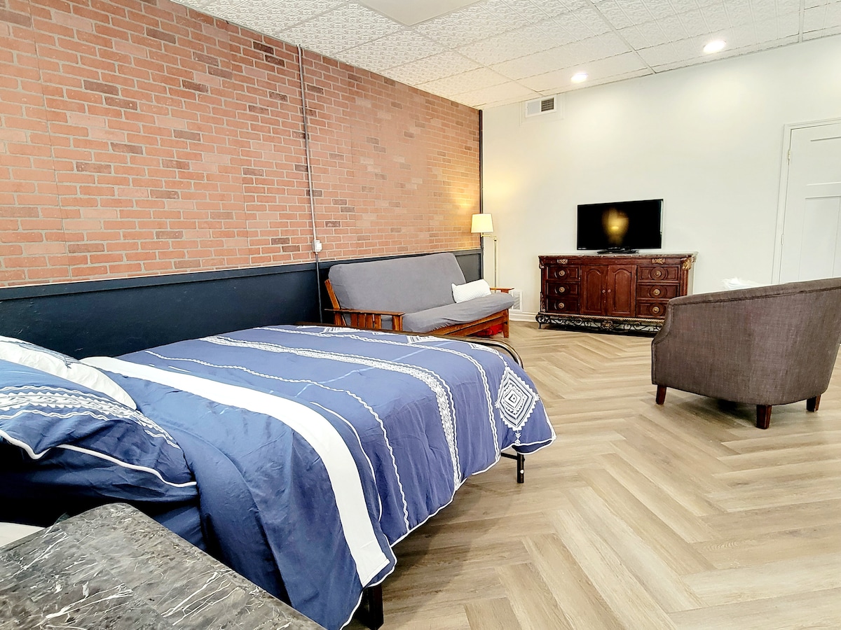 Disfruta del encanto del campo en esta suite de dos dormitorios y un baño. Quédate en la planta principal o escóndete arriba bajo los aleros, un pequeño espacio de escapada sereno. Disfruta de tu café en la terraza privada y de las vistas al campo. La barra de café, el refrigerador, la tostadora, el microondas y el fregadero están en la cocina pequeña. Combo de bañera y ducha de una pieza completa en este encantador baño con revestimiento antiguo. A minutos de los restaurantes del centro y a pocas manzanas del hospital y las clínicas. Sin gastos de limpieza. Tarifa por persona.