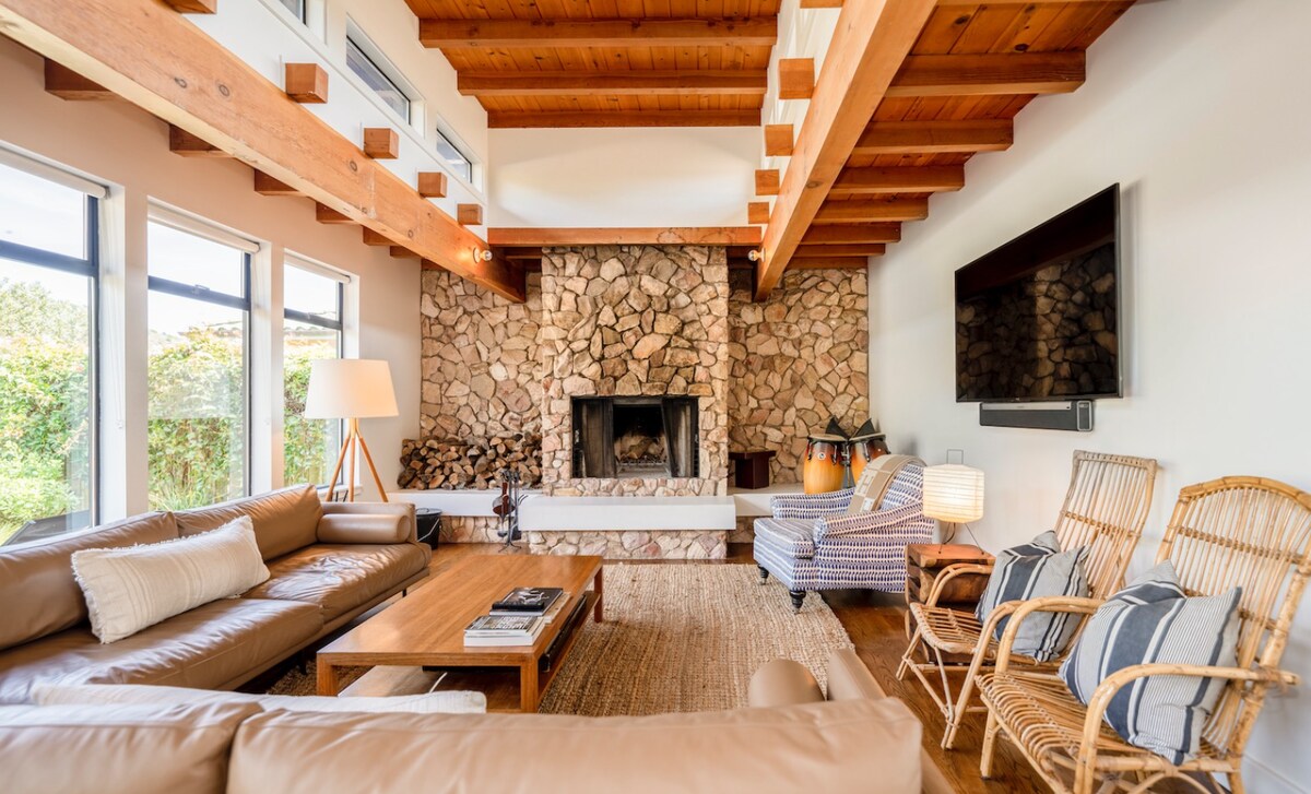 A blissful coastal retreat with unparalled ocean views, the Ocean Parkway House is nestled on a secluded bluff over looking the Pacific. This unique 1960's Bolinas beach house is a spot to truly relax and unwind. Fully updated with a curated mix of vintage and modern furnishings - our cottage has a mid-century design sensibility with luxuries like Coyuchi towels, a chef's kitchen, Scandinavian fireplace, outdoor rain shower, cedar hot tub, and new heated stone loveseat on the upstairs deck.