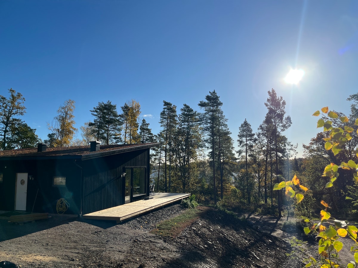 Cabaña moderna de nueva construcción en el bosque con impresionantes vistas al lago. La casa fue construida en 2020 y se encuentra en una colina cerca del lago Mälaren, a solo 1 hora de Estocolmo. La casa tiene 3 dormitorios, 2 de ellos con cama de matrimonio y 1 con litera. Todas las habitaciones tienen cortinas opacas para que la habitación se oscurezca por completo. 1 baño con inodoro y 1 aseo para invitados. También hay una sauna de nueva construcción. Una gran sala de estar/cocina con una vista increíble a través de las grandes ventanas. No se permiten fiestas.