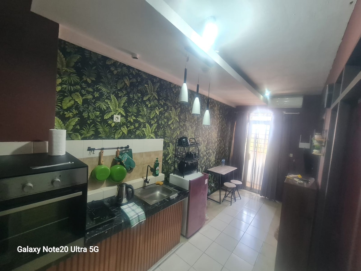 ¡Acogedor apartamento en el segundo piso con vistas a la montaña en el corazón de Bandung! Apartamento estudio con cocina totalmente equipada, TV, Netflix, wifi y diseño súper elegante. Con vistas a la piscina, puedes ver la montaña por la mañana mientras bebes tu café en el balcón. El apartamento tiene 1 cama tamaño queen y 1 cama adicional si necesitas que quepan más personas. La piscina y el gimnasio son a petición :). ¡Completado con una mesa de comedor plegable para ti! ¡Los niños se alojan gratis! ❗️: 50 % de descuento para estancias largas, pero se excluirán las facturas de electricidad y limpieza.