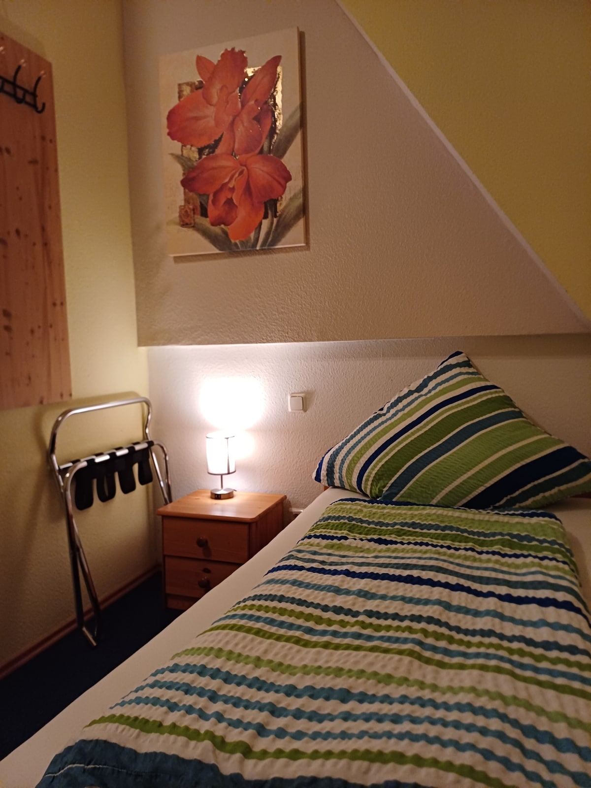 Ducha / WC, secador de pelo, W-Lan, TV de pantalla plana, escritorio, caja fuerte. Esta habitación individual, renovada en 2019, tiene TV vía satélite y minibar. No hay ascensor disponible. Se encuentra ubicado en la Pensión Löhr en Adlerstrasse 2. Tamaño aprox. 12 metros cuadrados. Ocupación 1 persona. El huésped paga un impuesto adicional para visitantes de 3,80 EUR por persona por noche a su llegada