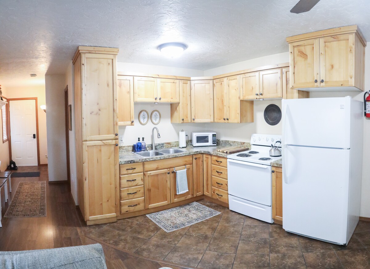 Este moderno departamento tipo estudio abierto y refrescante está a una cuadra de Porter Park y a 3 cuadras del campus de BYU-Idaho. En el momento en que entras al departamento, sientes la suave luz de las enormes ventanas y te preguntas... ¿es realmente un sótano? Encontrarás un baño de lujo equipado con chorros corporales, ducha de efecto lluvia y bañera profunda llena de caños de cascada. La cama es maravillosamente cómoda con un topper esponjoso y transpirable. ¡Incluso puedes acurrucarte en el fuego o disfrutar de tus programas favoritos en la televisión inteligente!