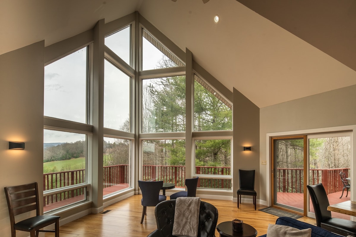 Nuestra hermosa casa con estructura en A, con un toque moderno de mediados de siglo, está escondida entre los rododendros y abedules de la montaña Beech. Estamos ubicados fuera de lo común de la ciudad, pero muy cerca del club de montaña Beech y del centro de esquí (5 minutos). ¡Los telesillas, restaurantes, senderismo, golf y todo lo que Beech Mountain tiene para ofrecer están a pocos minutos de nuestra puerta! Nuestra casa tranquila y espaciosa tiene 1800 pies cuadrados de suave luz natural gracias a sus grandes ventanales y es acogedora en invierno con dos chimeneas.