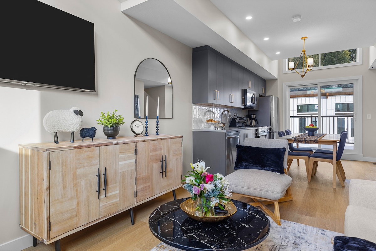 Welcome to your luxurious mountain retreat! This brand-new one-bedroom king suite accommodates up to 4 guests. Just a 10-minute walk from the town center, the suite features a king-sized bed, a pull-out king sofa bed, one bathroom, a fully equipped modern kitchen, flat-screen TVs, a washer/dryer, and luxurious linens and towels. The suite includes access to a hot tub, gym, and one underground parking space. Short-term rental license: RES-09778
