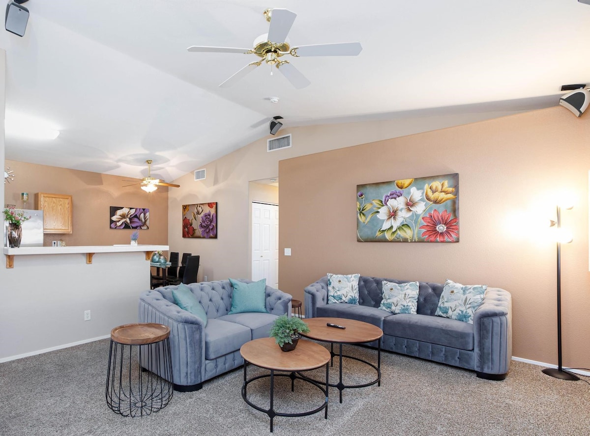 Escápate a esta casa de 3 dormitorios y 2 baños bellamente amueblada en el barrio más deseable de Las Vegas. Perfecto para familias o grupos (hasta 8), nuestro acogedor pero exclusivo refugio ofrece un patio privado, acceso a la piscina de estilo resort y una ubicación privilegiada cerca de los mejores campos de golf, restaurantes y entretenimiento. Piscina comunitaria reluciente junto al centro vacacional Área Premier segura y serena, calles transitables y ambiente tranquilo Ubicación ideal a pocos minutos de Red Rock Canyon, Summerlin Parkway y The Strip