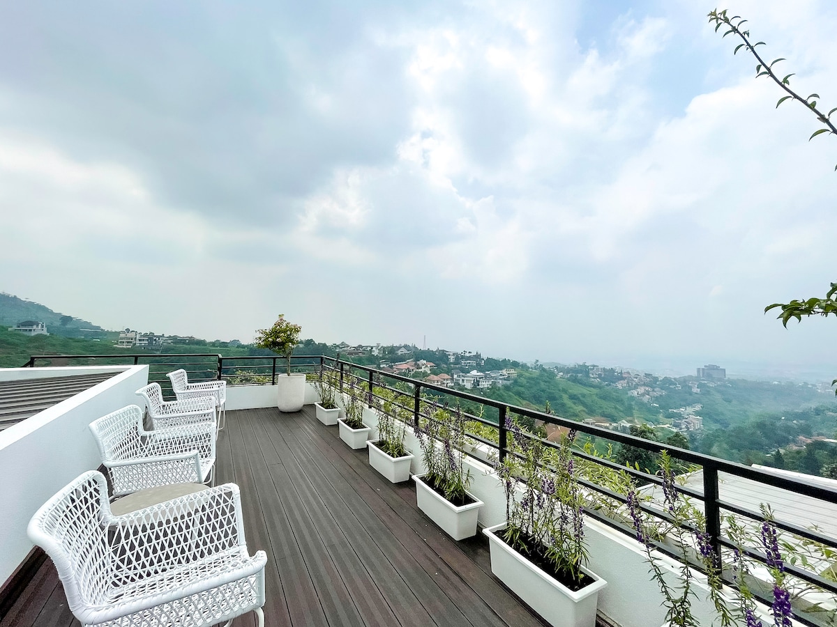 Villa privada, hermoso paisaje durante todo el día hasta la noche, el aire está limpio y fresco. La acogedora zona del balcón es perfecta para charlar y hacer una barbacoa. Piscina infinita privada y azotea disponibles con excelentes vistas. Una villa con un ambiente impresionante, con instalaciones de entretenimiento (billar y karaoke), cerca de donde las cafeterías más atractivas de la ciudad de Bandung. para los huéspedes que viven con niños pequeños, ofrecemos una zona de juegos para tu amado bebé, por lo que se unen a disfrutar felizmente de tus vacaciones.