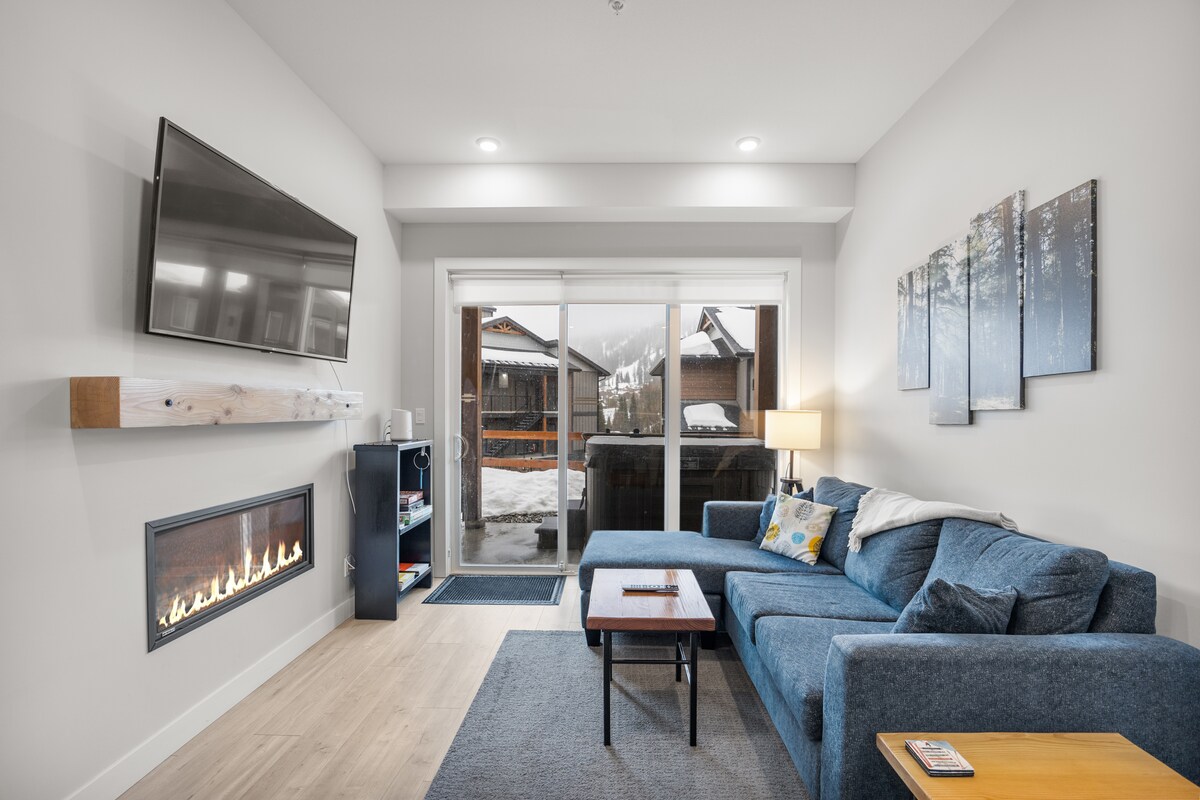 A cozy ski in ski out condo, with xc ski trails, two chairlifts, bike lifts a quick roll away and the Morrisey bike trails across the road! Some highlights include: • Ski in from multiple runs and ski out to two lifts from the Condo • Personal hot tub • Free underground parking space in the heated parkade steps from your door - chain and lock provided for bike lock up. • Gas fireplace, BBQ & heated tile flooring • Well Stocked kitchen • Access to green space in the courtyard from the backdoor
