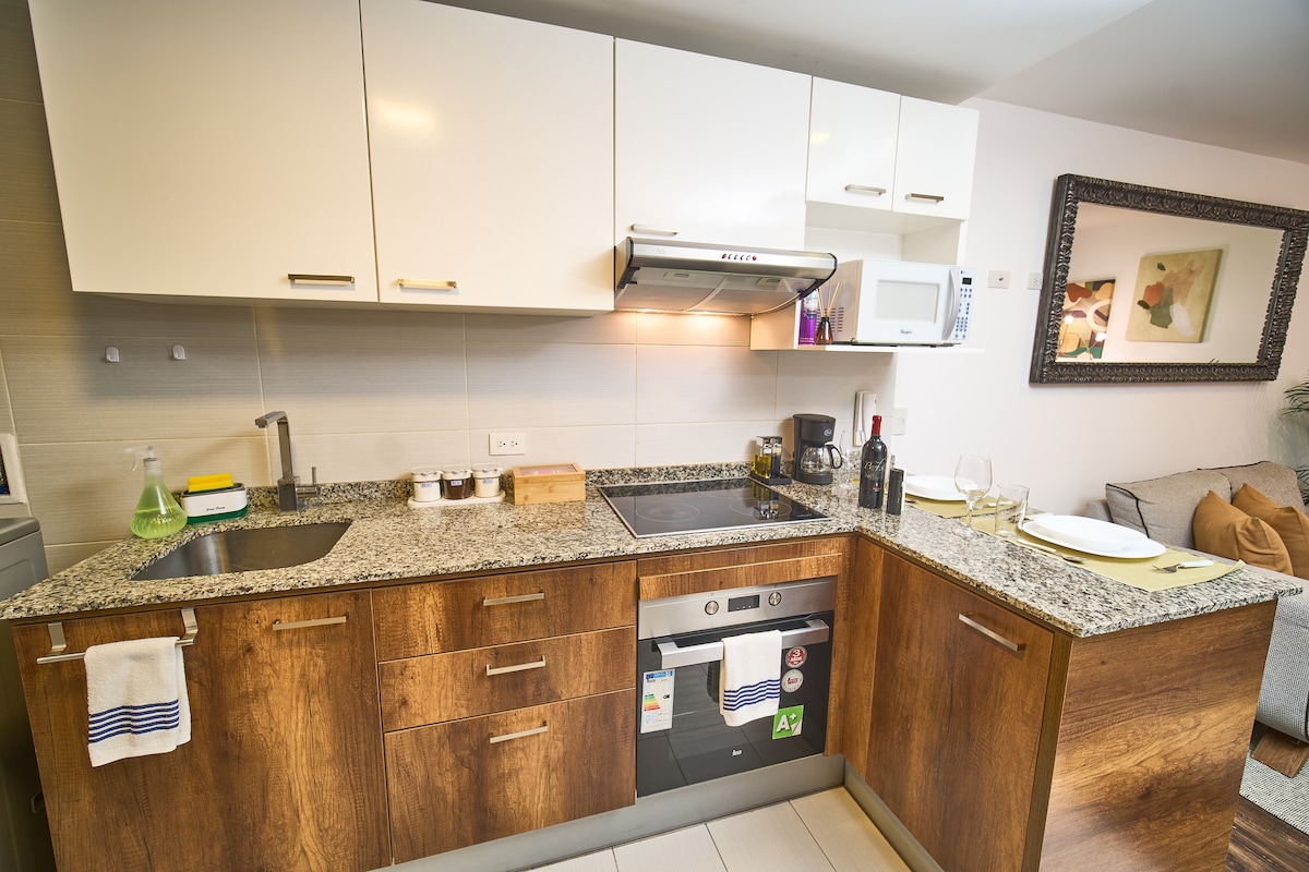 Warm Suite in floor #13 with 1 Queen size bed (high quality bedsheets, duvet and memory foam pillows), 1 sofa bed, maximum 3 guests. TV 75” QLED 4K, Disney+, Electric Black out Curtains, fully equipped kitchen with big Samsung fridge, digital modern oven, microwave and extractor, toaster, Coffee maker, Fast WIFI 343 mbps, working and dining Desk with view of metropolitan forest, clothes closet, Iron, ironing board, and 1 full bathroom with city view, hot water, towels, soap and shampoo