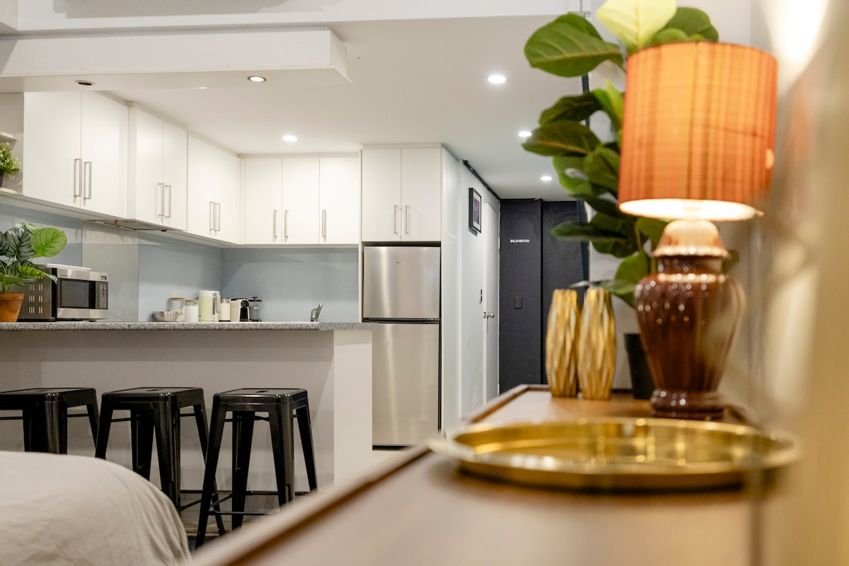 Experience the best of Sydney from this stylish, ground-floor studio with a private street entrance. This 48sqm open-plan retreat features high ceilings and climate-controlled comfort. Enjoy a full-sized kitchen, washer, and study nook, perfect for work or relaxation. Tucked in a quiet street in Surry Hills, you’re moments from Central Station, Oxford Street, Darling Harbour, Barangaroo, and the CBD—all within an easy stroll. Perfect for 2 guests, in a super-comfy king size bed.