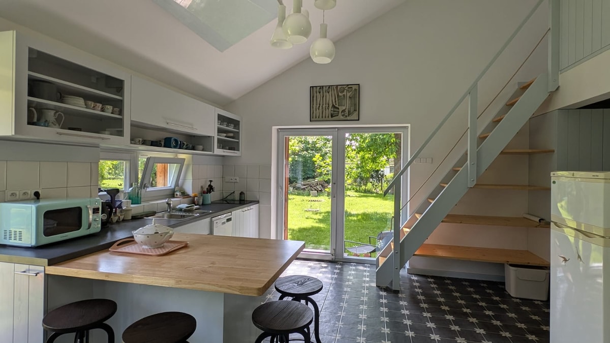 Una acogedora casa de campo rodeada de un jardín ofrece un alojamiento tranquilo con comodidades modernas. Una cocina totalmente equipada, una sala de estar luminosa y un dormitorio en la planta superior garantizan una estancia cómoda. Disfruta relajándote en el jardín, sentado junto a las flores o refrescándote en la bañera al aire libre. Ideal para relajarse en la naturaleza.