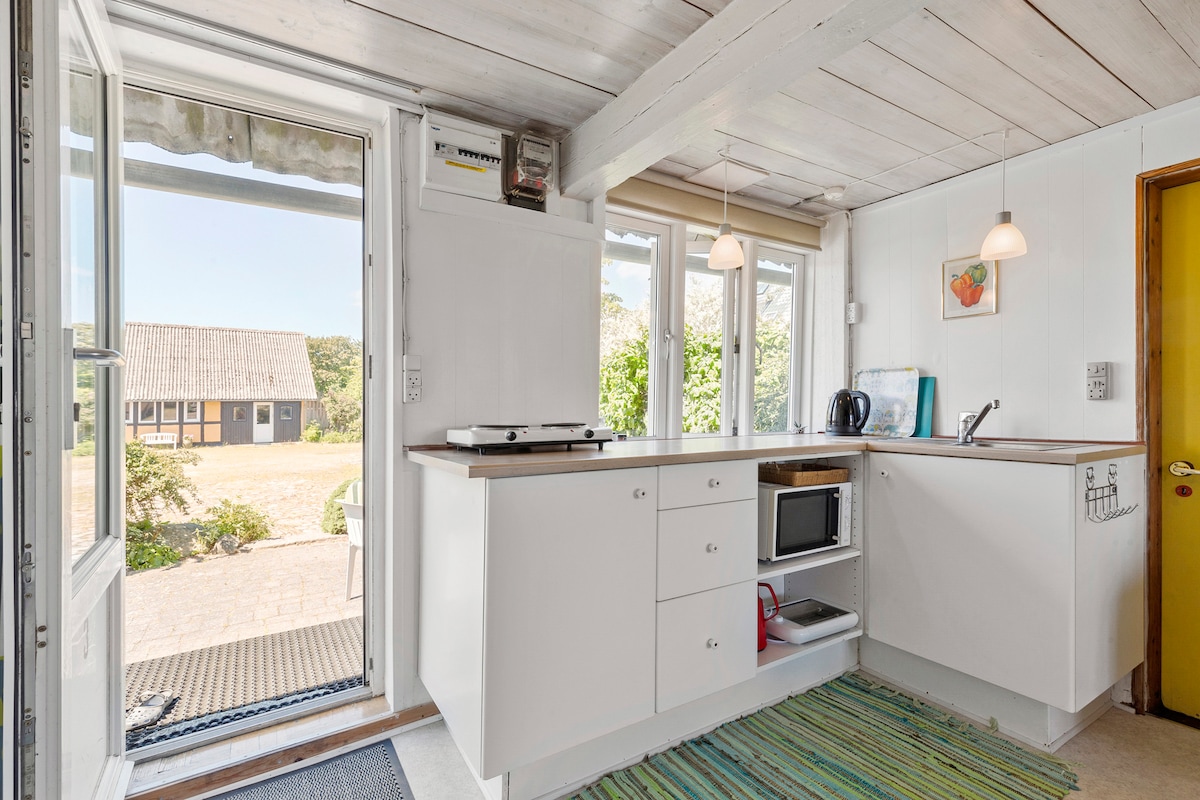 El apartamento "Udsigten" se encuentra a solo 150 metros del mar y en medio de la maravillosa naturaleza, justo al lado del Parque Nacional Mols Bjerge. El apartamento es de 60 m2 y es un apartamento con entrada propia, como parte de la privada en Blushøjgård Kursus- og Feriecenter. El apartamento tiene vistas a los cuatro puntos cardinales. Desde el acogedor y luminoso porche de cristal del salón hay vistas al mar y al patio hacia el mirador de Peter Dolmens høj, el punto más alto de la región, Kalesbakke y el huerto de manzanas de Blushøjgård.