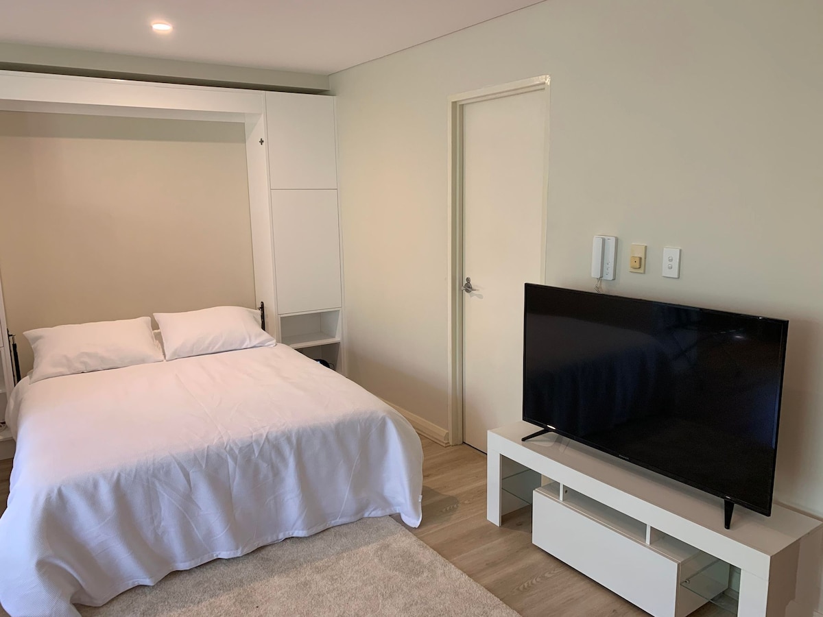 Precioso estudio de diseño arquitectónico en el corazón de Camperdown. Acceso por carril independiente. Cama tamaño queen, sala de estar, TV y wifi, cocina americana con nevera, microondas y cafetera y aire acondicionado. A 10 minutos a pie de King Street de Newtown, Enmore Road y Stanmore Village. A solo 6 km del centro de negocios de Sídney y a poca distancia a pie de RPA, trenes y autobuses. Explora y disfruta de los bares, restaurantes y tiendas en el corazón y el alma del interior oeste de Sídney.