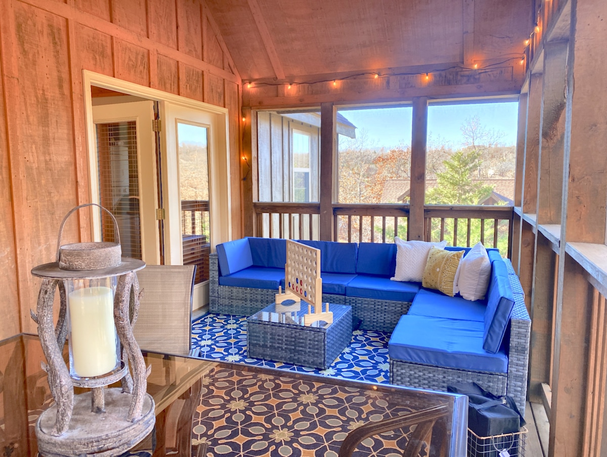 Relax in the heart of Stonebridge Village in this peaceful wooded cabin featuring 2 king suites, 2 ensuite bathrooms with jacuzzi tubs and showers, a heated screened porch with TV, and walk-in level entry. Enjoy resort amenities, a short walk to the family-friendly pool and lake, and quick access to Silver Dollar City, Table Rock Lake, and all the best of Branson.