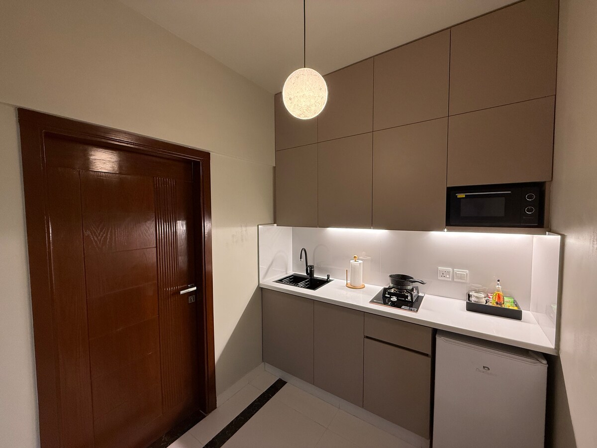Un moderno departamento estudio en Bahria Town Karachi con un dormitorio, un baño y una cocina totalmente equipada. Los huéspedes disfrutan de aire acondicionado, agua caliente, toallas limpias y todos los servicios públicos incluidos. El edificio ofrece 4 ascensores de pasajeros y 4 de carga, seguridad y recepción 24/7, estacionamiento gratuito y comestibles y restaurantes en el lugar. Perfecto para familias, viajeros solitarios y grupos pequeños que buscan comodidad y conveniencia.