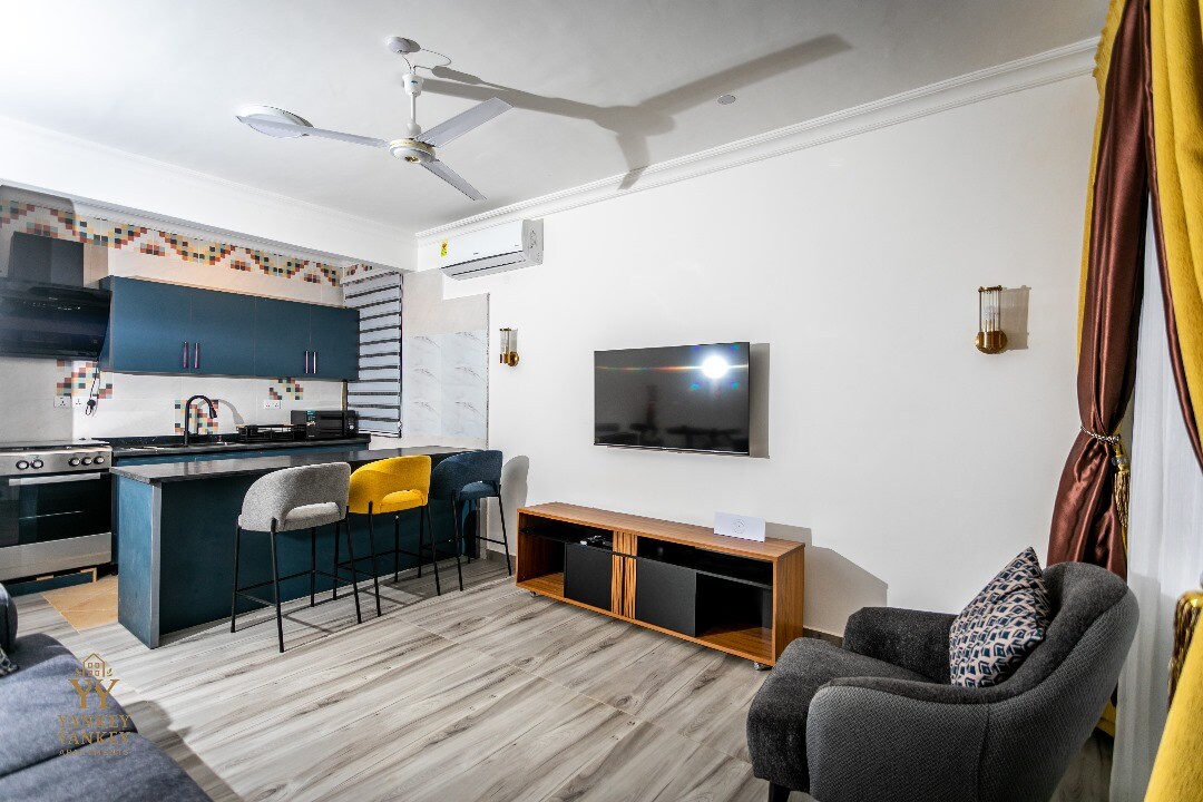 Este moderno apartamento de 2 dormitorios de servicio completo y familiar con 2,5 baños ofrece una piscina privada en la azotea y un exclusivo bar y parrilla en la azotea para familias o huéspedes. Ubicada en el corazón de la zona de Anaji de Takoradi, la propiedad cuenta con una cocina y un comedor totalmente equipados, con una isla perfecta para cocinar, trabajar o entretenerse. La sala de estar está equipada con un televisor inteligente de 75pulgadas, Netflix, wifi, escritorio de trabajo ejecutivo y una barra de sonido para tu entretenimiento.