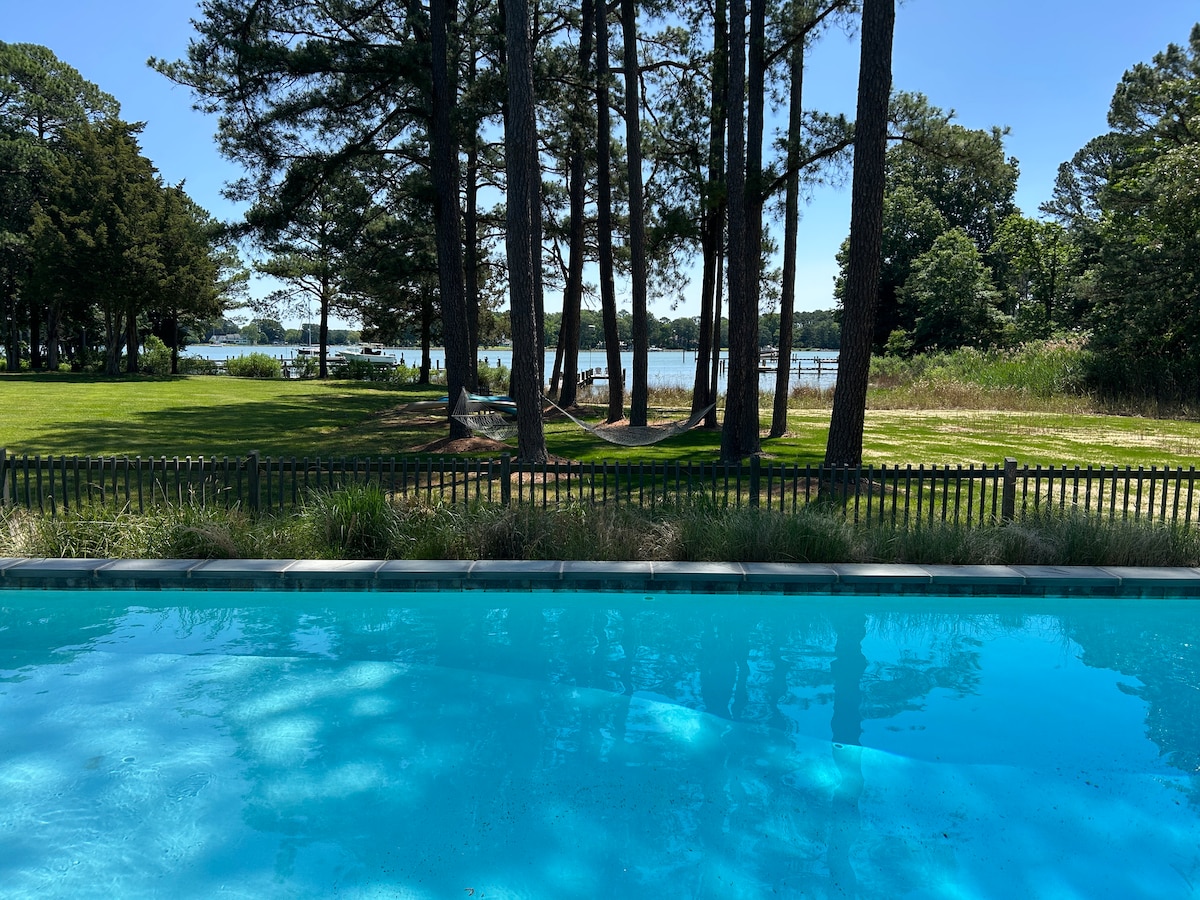 Disfruta de todo y relájate en esta hermosa escapada frente al mar de Cambridge en casi cinco acres. Cuenta con una casa de huéspedes con su propia cocina, 2 dormitorios y baño. La casa principal tiene 2 chimeneas, 2 amplias habitaciones familiares con una cocina gourmet. La suite principal tiene una bañera independiente. Solárium, piscina, terraza, muelle privado, gran parque infantil y estanque de pesca abastecido. Relájate en una hamaca, date un baño, sal a pescar o juega en la sala de juegos. Este lugar tiene algo para todos los gustos.